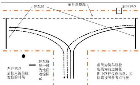 3:右车身即将撞上右边库角 方向回正 往后开一小段 等车尾进入库内再次右打死 待车正回正一圈半方向 (马上就压线)