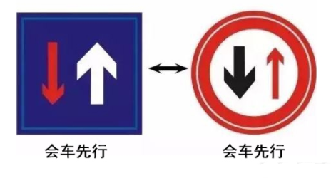 会车交通标志设置为两上反方向的箭头,一红一白为会车先行,一黑一红为会车让行。