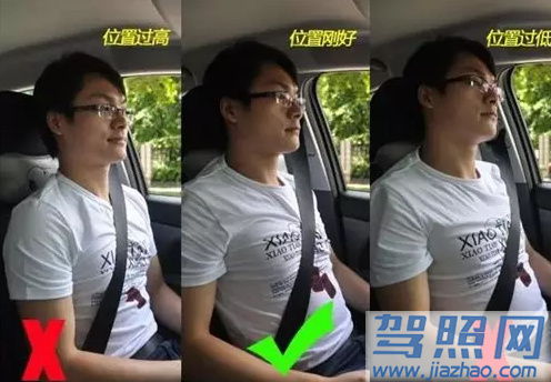 当安全带肩带位置太高时,会有可能割伤驾乘人员颈部;而当安全带肩带位置太低时,安全带肩带容易滑落导致无法限制驾乘人员身体前倾。所以在调节安全带高度时,我们应使安全带肩带跨过我们肩部的中央。