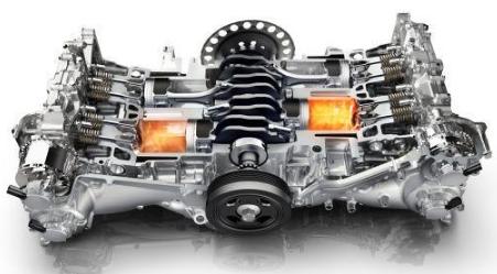 水平对置发动机,发动机活塞平均分布在曲轴两侧,在水平方向上左右运动。使发动机的整体高度降低、长度缩短、整车的重心降低,车辆行驶更加平稳,发动机安装在整车的中心线上,两侧活塞产生的力矩相互抵消,大大降低车辆在行驶中的振动,使发动机转速得到很大提升,减少噪音。