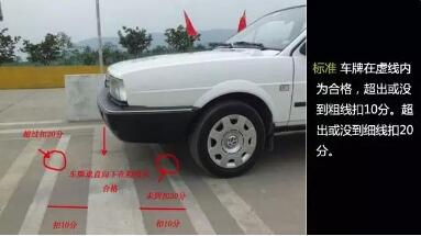 3、半离合控制车速,慢速靠近停车点,当左边后视镜的相应参考点与第二条粗黄线(100分线)齐平时先踩脚刹,后踩离合,停车,拉手刹(听到3响为止,不规范操作时踩死脚刹也不扣分)、回空挡,关右转向灯,等待语音提示:(4)定点准确。