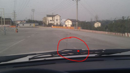 因为有些朋友急着考试,这种细节可能练习的不多。我这里再教一种简易方法,考试场地的地上有一个直行箭头,让你的前挡风玻璃的左下角切着这个标志,那你的车距离右边线就在30-40cm左右。这不是个相对准确的位置,在有的坡道定点上没有这个箭头,在训练场时候也不一定有,但是在考场里的直角转弯和侧方位停车基本都有,如果你实在理不好这个边线,可以尝试这个简易办法。