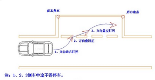 1、 轻抬离合使车后移,控制好车速,看左后视镜,当右起点感应线出现在左后视镜位置时把转向盘右打死。