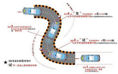 车进入S路时, 当看到右车头盖住右S边线时,向左回正方向。并点刹车及时放开。等左车头盖住右S路基线时,向左再打一周多方向。稳住并根据小圆镜中边线大的一方稍微调整。 车进入S路时。 当看到左车头盖住左S边线时,向右回正方向。并点刹车及时放开。等右车头盖住左S路基线时,向右再打一周多方向。稳住并根据小圆镜中边线大的一方稍微调整。 千万注意方向不能打死。要及时调整和观察反光镜中的变化。