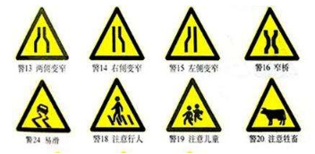 警告标志是警告车辆、行人注意危险地点的标志。警告标志的颜色为黄底、黑边、黑图案,形状为等边三角形,顶角朝上。