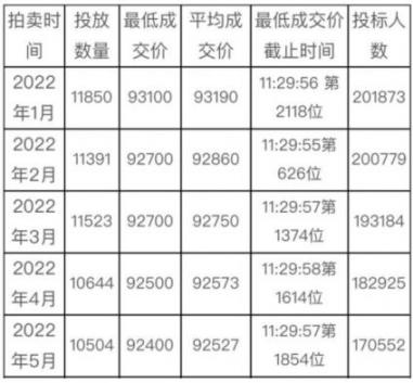 5月:合计拍卖总数10504辆,170552人竞拍,最低成交价:92400元,均价92527元,中标率:6.2%。