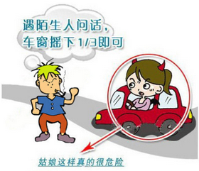 上车前,要注意观察四周有无可疑的人,在确认安全的情况下再上车。若有可疑情况,可假装找不到车子,快速向保安走去,千万不要往自己的车边走。如果是去地下停车场取车,单身女子要特别小心,最好请入口保安陪同前往上车后,要第一时间锁上车门,在车辆未启动前不要打开窗户玻璃。现在,不少驾龄短的女车主,上车后就习惯性地摇下车窗,把头伸向窗外看路。一位办案民警说:"这个时候摇下车窗太危险,犯罪分子说不定会用刀架在你的脖子上,然后拔掉车钥匙,打开车门侵入车内。"在人流比较少的地下停车场,女士要特别当心。