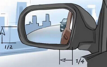 右后视镜:上下位置,地面面积占镜面的2/3,能看到后轮的轮眉(车轮上方突出的部分,弯曲,像眉毛);左右位置,使车身占镜面1/4。