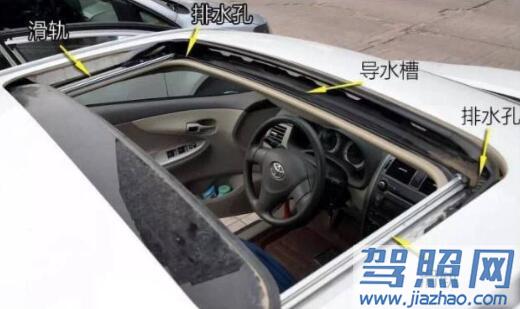 首先我们先来看一下天窗的结构和排水原理,天窗的左右两侧是两个导轨,导轨的作用主要是保证天窗前后滑动,滑轨前面两个角上是天窗的排水孔,两个排水孔的中间是一个导水槽。每当下雨或者是有水打到天窗的时候,水就会进入导水槽,然后流到两边的排水孔,排水孔和A柱之间有一个排水管,水通过排水管经过A柱倒流到前侧轮胎的挡泥板出拍出。除了前面两个排水孔以外,天窗后面两侧也有出水口,它可以将水通过汽车的C柱流出。