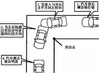 4、当左后轮越过内直角突出点时,开始逐渐向右回方向驶出弯道;
