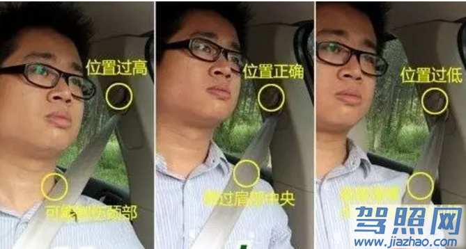 首先,我们先来看一下使用安全带时几种不同情况。安全带的高度可调,驾驶人或乘客在使用安全带之前应调节适当高度,下图分别是位置过高、正常、过低三种情况对比。