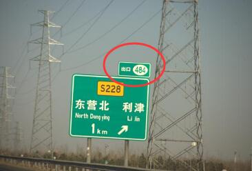 在高速公路上,一般距离出口3km左右时会有出口信息提示,如图所示,该图片的信息有,距离东营北,利津出口还有1km,东营北与利津是两个相反方向的地名,下高速之后的道路为省道228,右上角的编号相信大家应该不陌生,但是代表什么含义可能不知道,出口484,代表该出口为该高速公路的第484个出口。