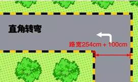 2、汽车进入直角弯之前,尽量靠右侧行驶,使自己看见车头的三分之一越过右侧边线;