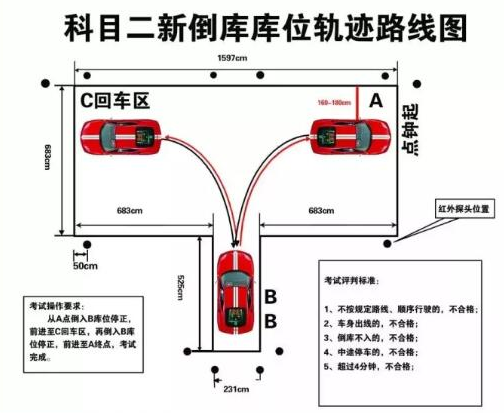 (注意,都是以向右打方向为主)当车子从A点开向B点时,方向盘首先要向右打死---通过右侧后视镜观察,当车身与右侧的前库角距离,在后视镜中约为两指(3cm)时,回1圈方向盘。继续倒车---当库角与后视镜下沿重合时,方向盘向右打1圈---当库两旁黄线与车身平行,回正方向盘,停正。