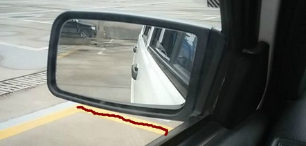 四, 方向起早(如下图,车身右侧与库位右前角45公分相交时,这个距离点出现在前门把手上,那么此时不是回半圈了。第一步,应该回一圈,避免右侧车身压角或压线。第二步,再继续观察右后视镜,右库角在镜子里完全消失后,方向重新往右打死,以避免车身左后侧扫线或压线。第三步,车身左侧与边线平行回一圈半方向,接下来准备停车。