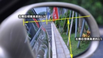由于驾驶座位在左侧,所以司机对车身右侧的情况较难掌握,因此,右侧后视镜在调整上、下位置时,地面面积占镜面的2/3,能看到后轮的轮眉(车轮上方突出的部分,弯曲,像眉毛),而左、右位置则调整至车身占据镜面范围的1/4。