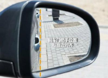 有路沿的路段,观察车身右侧与路沿之间的距离,进行调整。直至右侧前门把手位置,将遮住马路牙,或者将“接触”时,迅速顺直车身,此时车身距离路沿为30公分左右。