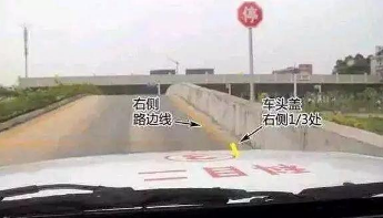 学员可以将发动机前盖三等分。当发动机前盖右侧的三分之一处与路边线重合,车身距离边线刚刚好就是30cm。如下图: