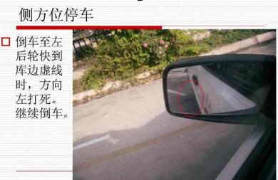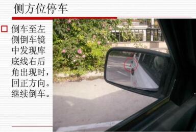 3、倒车至左侧停车镜中发现库底线右后角出现时,回正方向。继续倒车。