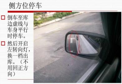 5、倒车至库边虚线与车身平行时停车,然后开启左转向灯,换一档出库。(不用回正方向)