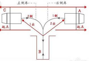 先从“A”经过“1倒”进入“B”,从“B”出来经过“1出”进入“C”,再从“C”经过“2倒”进入“B”,最后从“B”经过“2出”进入“A”考试结束。