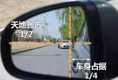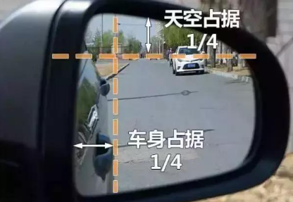 1、左后视镜调整:把水平线置于后视镜的中线位置,然后再把车身的边缘调整到占据镜面影像的1/4。