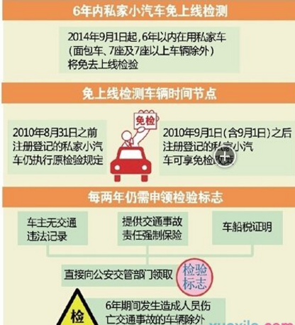 (3)小型、微型非营运载客汽车6年以内可免检2次(需每两年申领一次年检标志);超过6年的,每年检验1次;超过15年的,每6个月检验1次。想知道怎么车检的,请看:不花钱不看车 新政策6年免检验车体验