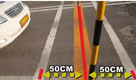 车辆停稳后,汽车前保险杠要垂直对准桩杆线,保险杠不得超过或后退至桩杆线50公分以外的区域,且前后轮不得轧道路边缘线。
