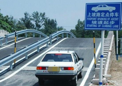 6、车行驶将至坡道标志杆前,迅速松开油门并放置刹车位置,到标志杆时,迅速将离合器与刹车踏板同时踏下停车。