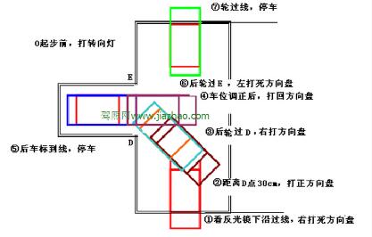 考试的时候,我们先要将车子从上图中④的位置开到⑤的位置,在这个过程中,我们要怎么确保将车子位置调整准确呢?其实,在考试过程中,水泥面上都会有标线或者水泥缝供我们参考,在开车的过程中,将车子的左车筋对准上图中那条粗粗的白线(现实中可能是水泥缝等)、摆正车身就行了。然后右边门把手中间对准右红虚线的时候停车,挂倒挡,向右打死方向盘就可以抬离合走了。同时,看左边后视镜,当看到车身与边线将要平行的时候,立即回正方向盘,在左后视镜下沿与②线重合的时候踩离合、踩刹车。