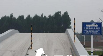 ⑶准确定点停车 始终紧紧追对定位铁板左前角,直到看不见时为止;在看不见定位铁板左前角时,缓慢向左微打方向,使车头逐渐、并在停车前与定位粗线或坡顶水平平行;当前挡风玻璃右下角与定点停车区右侧定位侧板前边对齐、或左前窗窗花与定位细线前部精确对准、或左视镜下缘距离定点粗线后缘15厘米时,立即踩离合、踩刹车停车,关闭右转向灯;此时,车前轮正好处在定位细线的前缘、车头保险杠正好位于定点粗线的正上方,坡道定点停车完成。