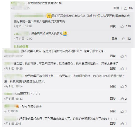 事件一出,在网上引起了巨大的讨论,一些人认为女司机就不应该开车;一些人认为关键不在于女司机,而是新手司机,毕竟男司机的事故率比女司机还要更高;更有大V直接转发评论称这是杀人……