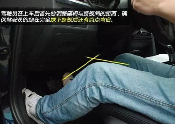 然后将离合踩到最低点,在脚跟不离地的情况下膝盖要保持弯曲,若没有,应前后调整座椅距离。