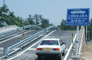 (1)听到“坡道定点停车”指令后(立刻打开右转向灯),向场地右侧靠;(起步时如果有坡度时,为防止溜坡,要用半坡起步法起步)。