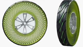 在2005年,米其林推出了名为Tweel的全球首款非充气轮胎。Tweel的推出彻底改变了现代轮胎必须由压缩空气提供支撑的做法,取而代之的是轮胎与轮辋一体化的设计,用于提供整条轮胎刚性的是从轮胎侧面辐射开来的网状支撑结构,该网状结构根据不同企业的不同而有所不同,无论何种结构,其功能都大同小异,为轮胎提供支撑,同时通过支撑结构的形变来减小轮胎的震动,达到改善舒适性的目的。