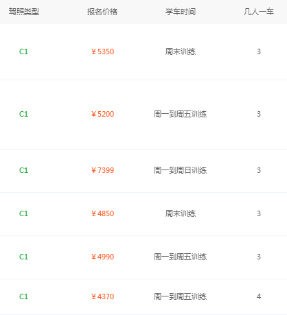 C1周末班:4350元(练车时间 周六周日 早8:30至19:00)。