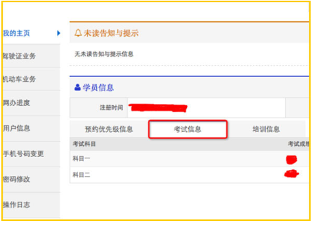 3、登录进去后,在弹出的【我的主页】界面中,选择【考试信息】,就能看到已考科目的成绩了。