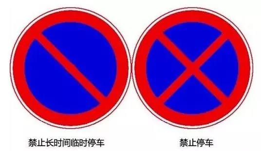 提醒:标志非常类似,区别在于圆圈中间的斜杆数量。学员只需要记住,一条斜杆是禁止长时间停车,临时停车不受限;两条斜杆交叉是禁止停放标志。