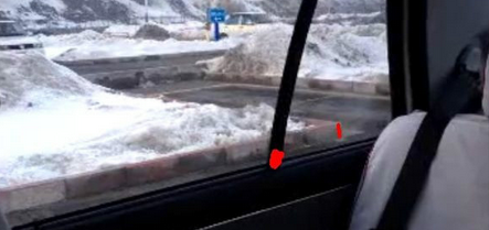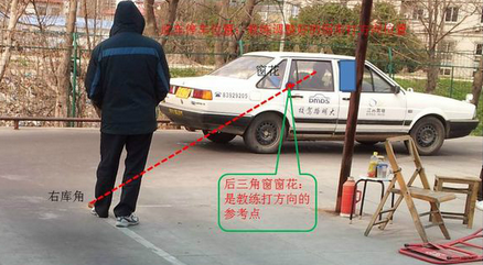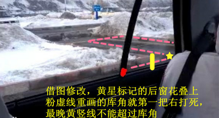 1. 看右后三角窗窗花叠上右库角,右打死。(有人用黑立柱或立柱前面那个窗花当点,但我们的方式是早打死、早回、早调正,最后车身调好可以直倒入库时,车尾还在库口外一尺多远。这样预作准备比较好,有调整的余地。)