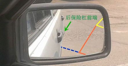 3. 看上图库角(画成橙色)往下走,在镜子下沿消失,就再次右打死。蓝色虚线是库口延长线,一定要等到前门把手走到这根延长线上面,才叫作入库,这时才能打死方向盘。这时就可以回头等待左镜中出现左库角与左边线了,也可以继续看右镜中车尾在逐渐入库。总之参看左右镜,车身即将调正时就回正方向盘,直倒入库。