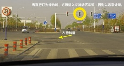 左转待转区,是指将左转车道向路口延伸一段距离并用白虚线进行施划,只有直行绿灯亮时,需要左转的车辆才可进入这个区域等待,左转绿灯亮时才能左转,以此提高路口通行效率。