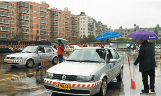 下雨天考试场地和路面湿滑,要放低车速,不要急踩刹车,否则车辆很容易因急刹而“跑偏”。