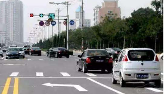 3.路口左转:开左转灯,看左视镜,在虚线区驶入左转车道,踩离合微带刹车减速至17-8速,3档变2档(速度太慢变1档),观察左侧交通情况,左转方向慢行礼让左转通过路口。