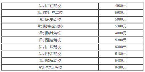 以下是深圳驾校排行榜位前十的驾校收费状况