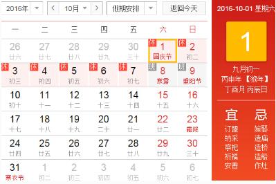 2016年国庆节10月1日至7日放假调休,共7天。10月8号(星期六)、10月9号(星期天)公休调至10月4号(星期二),10月5号(星期三)10月8号(星期六)10月9号(星期天)正常上班;