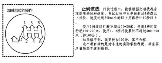 要求150米内,加档是从1-2-3-4,减档是4-3-2。考试时的要求是转速不能超过 2000转,过程中要尽量保持车辆平稳,最好不能有较大震动感。换挡时,要在空挡停留一下(手不要抓住档位杆不放,要适当抬起--因为有感应器);松完离合后,脚要完全脱离离合,踩离合时要快速踩到底再挂档(有感应器)。