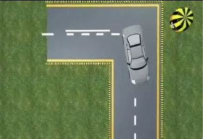 四、进入直角前,让车在路两边内尽量远离转弯点的标志杆向前慢速行驶,当靠近转弯点一侧的前窗上小三角窗中心与转弯点重合时,向转弯点一侧大方向到底,通过后车头正时回正方向。