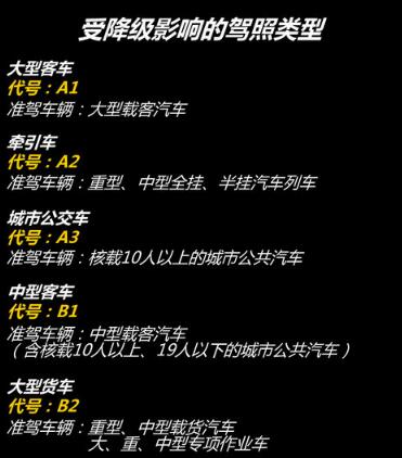 对于持有大型客车、牵引车、城市公交车、中型客车、大型货车驾驶证的,按规定要降级的,对照下表降级: