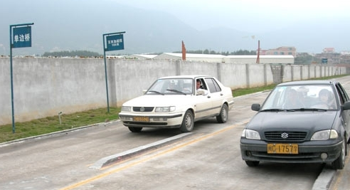 在单边桥考试时,驾驶员要正确掌握方向,将道路两侧的各一座窄桥先后压在左、右轮下,并平一直线上。上桥后,尽量减速(有必要踩一下脚刹)左后轮刚下时,方向立刻向右一圈。当左车盖线对住右桥左侧边缘时,方向立刻向左二圈。当右前轮上桥后,方向立刻向右一圈,之后再进行方向小幅修整,直至车头摆正,若车头已正,就不必修整方向。