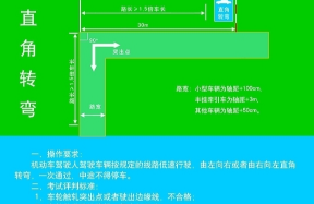 多数地区是将右向直角转弯作为考试标准(左向直角转弯基本相同)。当我们驾驶考试车进入直角转弯区后,要使车辆右侧与路边线保持在30公分的距离左右(此距离的把控很重要,如果距离小于30公分,容易使车右侧轧线;如果大于30公分,左侧触线的概率就会大大增加)直线前进,保持正确的驾驶姿势,当我们观察到车辆引擎盖最前沿与边线重合时,迅速将方向盘向左打到底,等到车身完全转正,迅速回正方向,直角转弯结束。